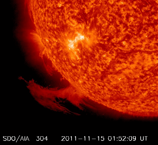 Ένα μαγνητικό ηλιακό έξαρμα, που βρίσκεται σε εξέχουσα θέση κατά μήκος του νοτιοανατολικού άκρου του ήλιου, έγινε ασταθές στις 15 Νοεμβρίου και σιγά-σιγά εξερράγη. Το παρατηρητήριο ηλιακής δραστηριότητας της Nasa, κατέγραψε το γεγονός, το οποίο εκτυλίχθηκε κατά τη διάρκεια μιας περιόδου δεκατριών ωρών.